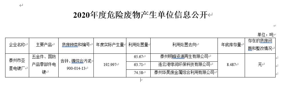 項(xiàng)目公示 | 泰州市亞星電鍍廠2020年度危險(xiǎn)廢物信息公開